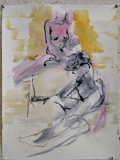 I had forgotten that today was the last day of drawing, AND we had two models. Ack! It's all good, but for me at least, this combo requires twice as much thinking and planning. On a good day that is a really interesting challenge. Today there was a slight smell of burning as moved OUT of my head, into my compassionate mind body hand. This process requires real looking, and SEEING, prep for composition, materials choices, paper size.
